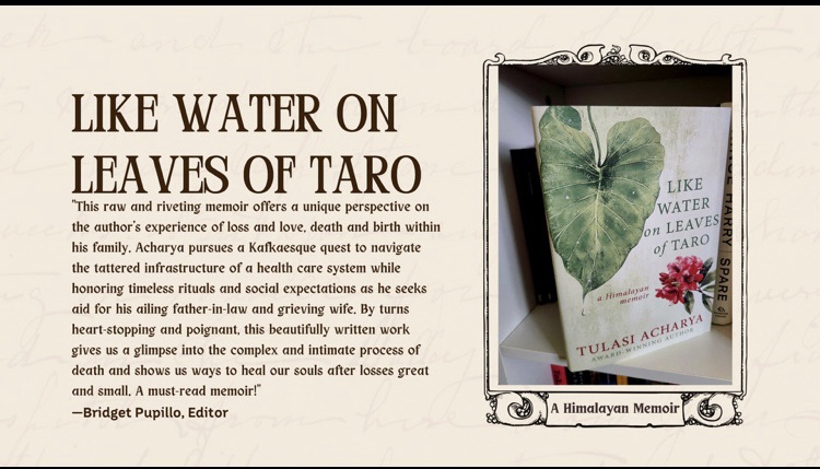 There are many scenes I would like to read from my books. However, the most recent one, the memoir “Like Water on Leaves of Taro” has some good scenes detailing the surrounding and social, cultural milieu of Nepal and its city and countryside life.