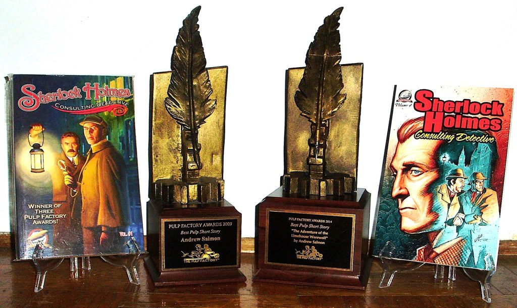 My name is Andrew Salmon. I’ve been writing/publishing pulp fiction in many forms for almost 20 years. My work has appeared in various magazines and I’ve worked with publishers such as Airship 27, Fight Card Books, Belanger Books, Saddlebag Dispatches and Pro Se Press to name a few. I’m mostly known for my Sherlock Holmes tales which have won a couple of awards along the way. A tale of mine was also nominated for the Arthur Ellis Award (the Canadian equivalent of the Edgar). My novel, The Light of Men was included in the Holocaust Memorial Museum Library in Washington, DC. I live and write in Vancouver, BC.